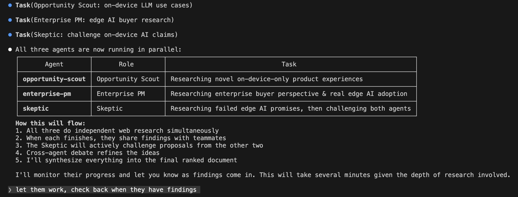Then I asked the lead agent to coordinate, and watched.