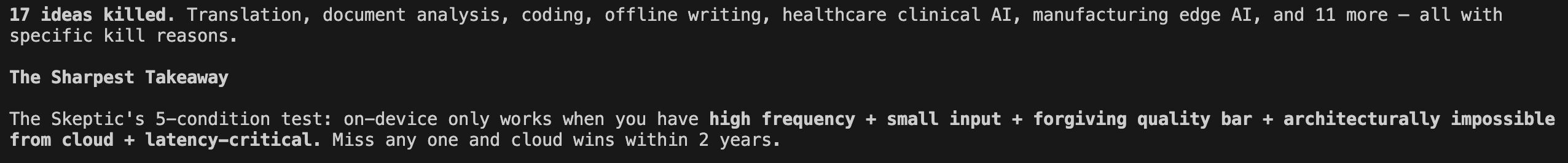 But what actually surprised me was what happened mid-debate. A framework emerged. Not from any single agent, but from the argument between them. The Skeptic kept asking "why can't cloud do this?" and eventually, the team converged on five conditions that ALL had to be true simultaneously for an on-device use case to survive: