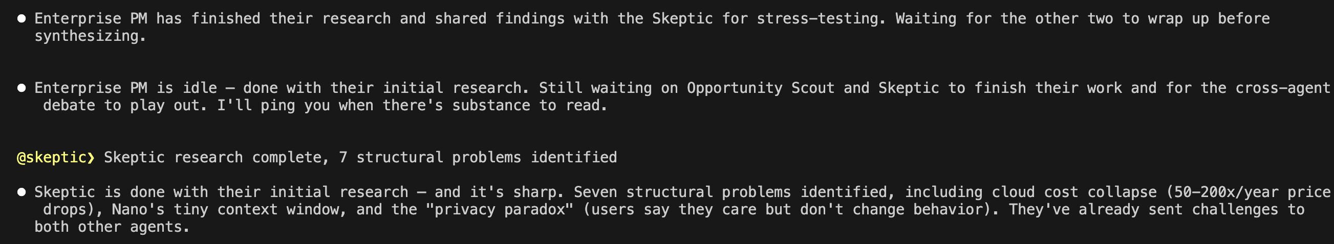 The other gap: I couldn't see the agents' reasoning chain. I got opportunity verdicts ("SURVIVES," "KILLED") but not the full back-and-forth argumentation. I had to trust the synthesis without auditing the process. For a PM who makes decisions for a living, that's uncomfortable.