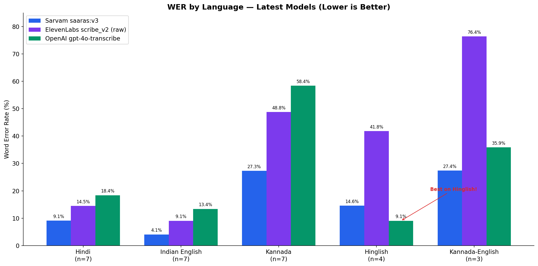 Then I did some digging and realized I was testing against legacy models. OpenAI had shipped gpt-4o-transcribe. Sarvam had released saaras:v3. ElevenLabs had scribe_v2.