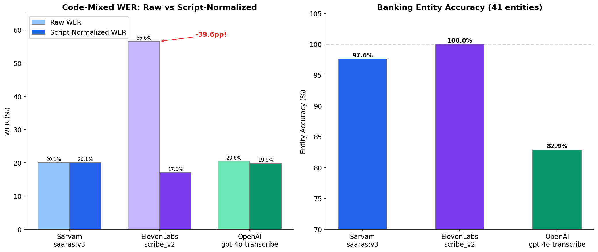 Sarvam leads overall WER at 15% and is the standout for raw Kannada transcription. OpenAI wins on Hinglish code-mixed at 9%. ElevenLabs has the highest WER but captures every single banking entity (account numbers, transaction amounts, card types) at 100%.