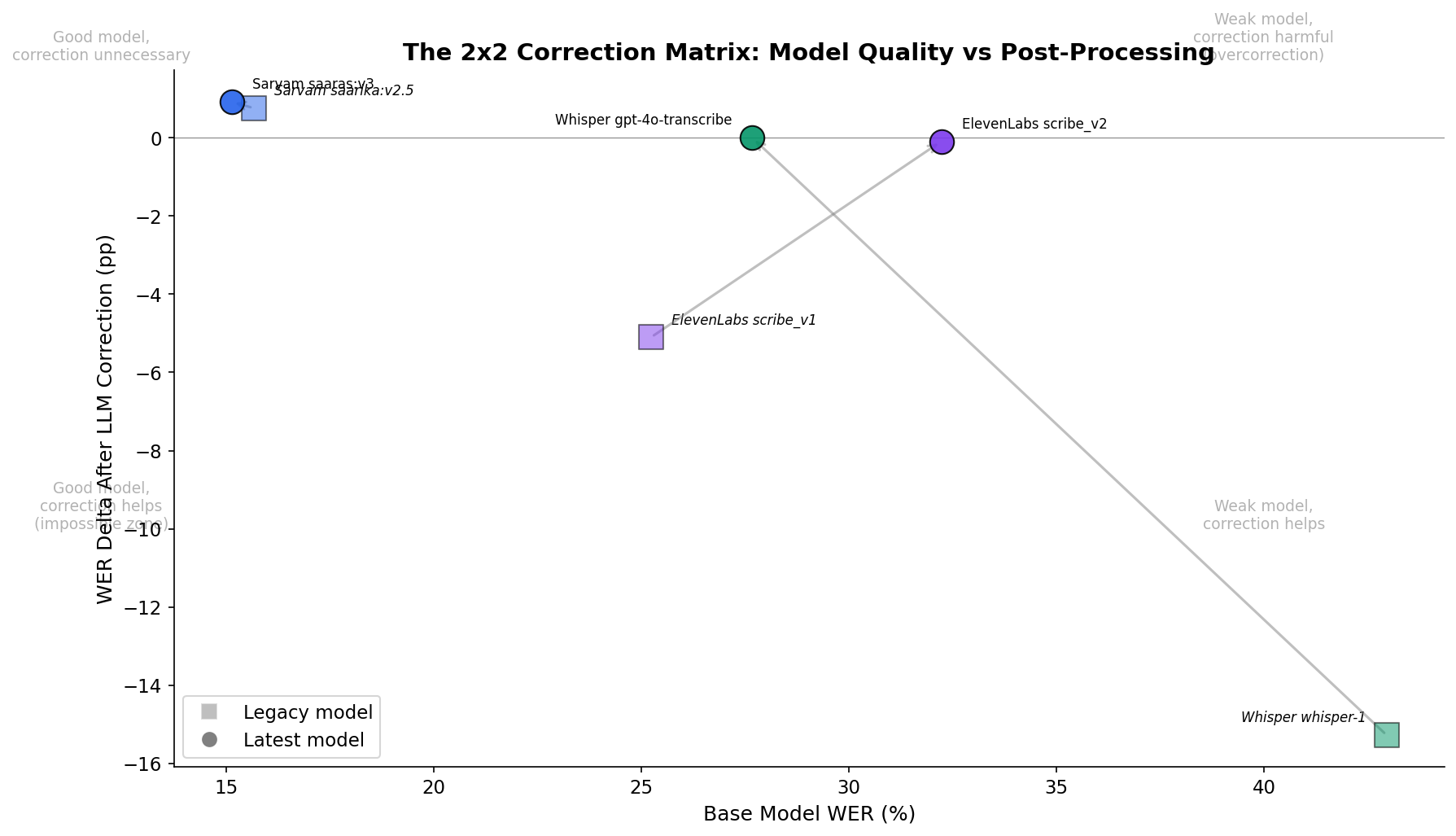 For Sarvam, correction actually made things worse. WER went from 15% to 18%. The LLM "corrected" dialectal variants to standard written forms, introducing errors where none existed. When the base model is strong, post-processing is unnecessary. When it's weak, upgrading the model is cheaper than building a correction pipeline.