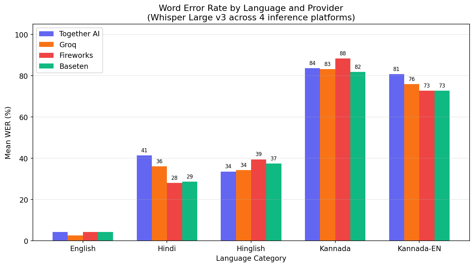 I decided to test this firsthand. I deployed Whisper Large v3 (the same open-source model) on four inference platforms: Baseten, Together AI, Groq, and Fireworks AI. Then I ran the same 28 audio files in Hindi, English, Kannada, and code-mixed speech across all four.