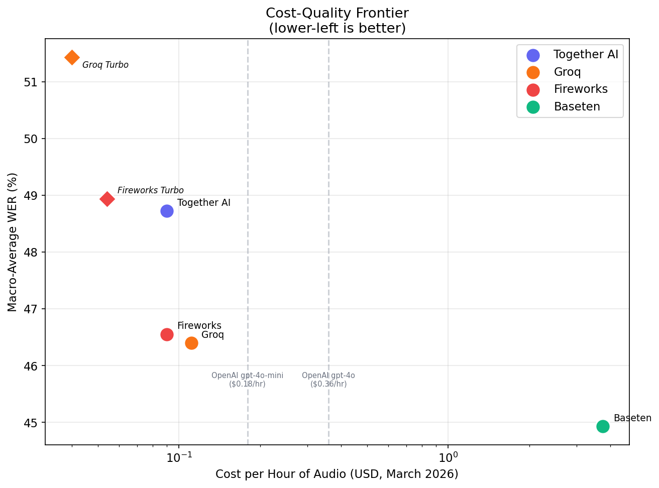 | Together AI | 41.4% | Drops words, shorter transcripts | 15.7% | 38.6% |