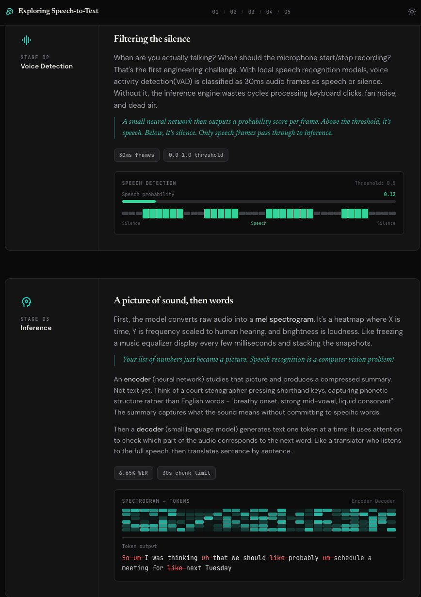 I also built an interactive visual explainer that walks through the full ASR pipeline in five animated stages, from raw audio capture through spectrogram inference to text insertion.